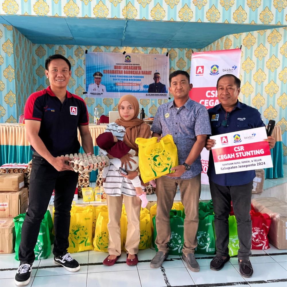 PT Midi Utama Indonesia Tbk atau Alfamidi Branch Makassar bekerja sama dengan BKKBN Kabupaten Jeneponto meluncurkan program Corporate Social Responsibility (CSR) penanggulangan stunting yang dilaksanakan di Kantor Kecamatan Bangkala Barat, Kabupaten Jeneponto, Sulawesi Selatan, Sabtu (13/7/24). Kegiatan ini bertujuan untuk memberi dukungan kepada puluhan anak yang terdampak stunting di wilayah tersebut.