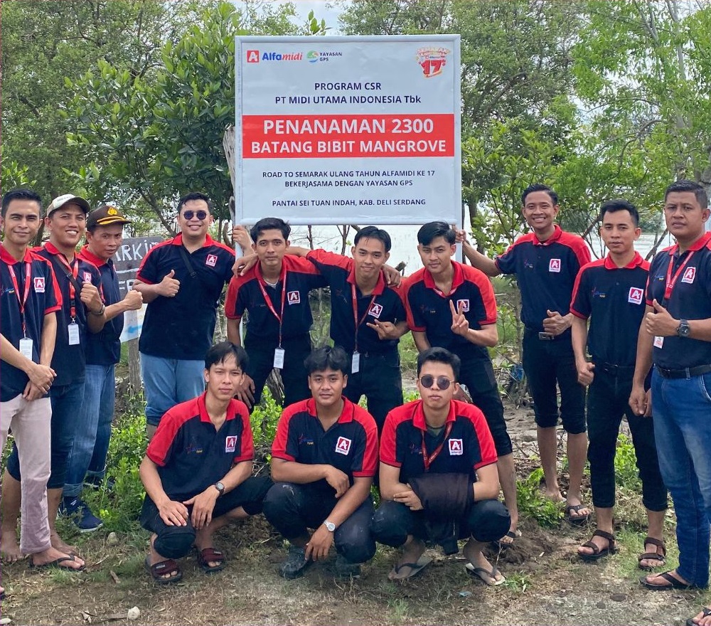 Alfamidi Cabang Medan melaksanakan kegiatan Corporate Social Responsibility (CSR) dengan menanam 1000 bibit pohon mangrove di Pantai Sei Tuan Indah, Kecamatan Pantai Labu, Kabupaten Deli Serdang, Sumatera Utara, Kamis (21/06/24). Kegiatan ini dilakukan dalam rangka memperingati 17 tahun Alfamidi melayani masyarakat Indonesia. Penanaman ini dihadiri oleh Kepala Cabang Alfamidi Medan, Martadi,