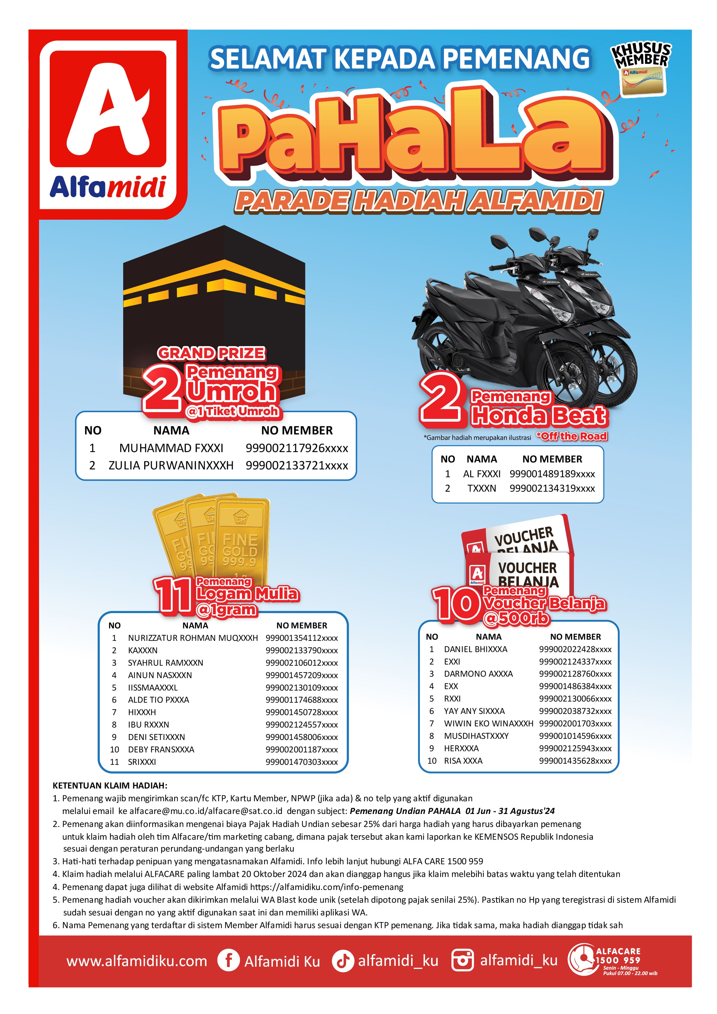 1. Pemenang wajib mengirimkan scan/fc KTP, Kartu Member, NPWP (jika ada) & no telp yang aktif digunakan melalui email ke alfacare@mu.co.id/alfacare@sat.co.id dengan subject: Pemenang Undian PAHALA 01 Jun - 31 Agustus'24